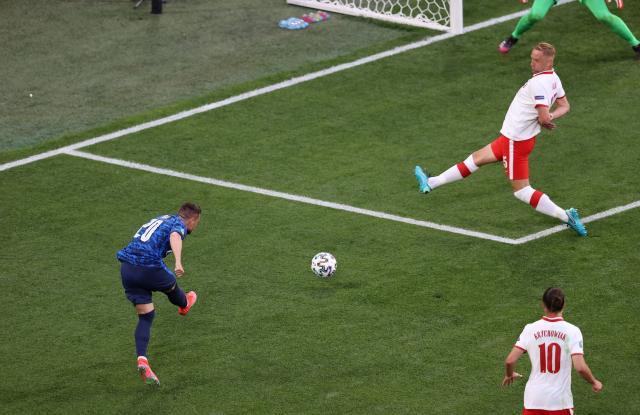 相对于斯洛伐克,开局阶段,波兰的整体阵型提得非常靠上,使得斯洛伐克有了更多的空间。第18分钟,马克从左路突破,右后卫贝雷申斯基被穿裆,尤日维亚克的协防也没有起到作用,中卫格利克补位的时候又慢了半拍。波兰整条后防线显得完全不在状态,马克的射门则反弹在什琴斯尼身上撞进网窝。